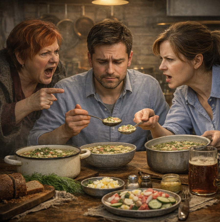 — Он просто из вежливости твою ест! — внезапно вспыхнула Тамара Ивановна, её лицо, обычно бледное, резко залилось густым румянцем. — Видишь, как он мою быстрее доел? Потому что она правильная! А в твоей и квас какой-то сладкий, и зелени мало! Окрошка должна быть острой, ядрёной!