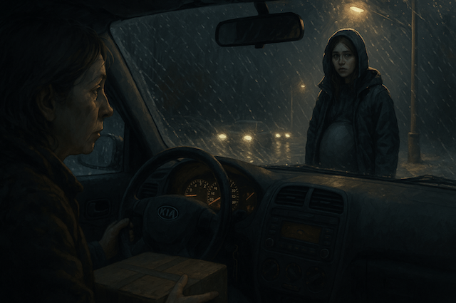 Её я заметила не сразу. Возле обочины, метрах в десяти от остановки, под фонарём стояла девушка. С первого взгляда — едва ли не школьница: слишком худые ноги в колготках, короткая куртка, а сверху кое-как наброшена огромная мужская «аляска». На голове — капюшон, волосы мокрые, в руках маленькая сумка. Ни рукой не машет, ни голосует — просто стоит, как забытая кем-то вещь.