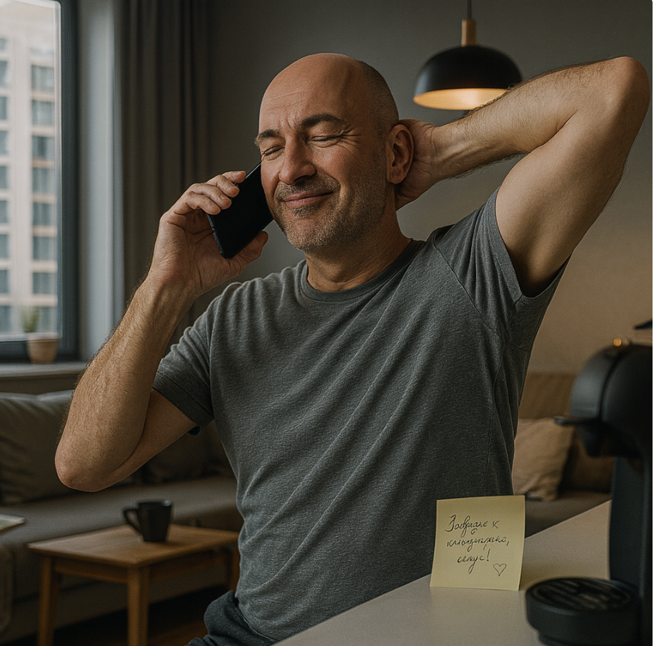 На следующее утро он проснулся у Алёны — современная студия, кофе в капсуле, записка: «Завтрак в холодильнике, целую!»