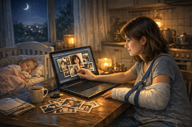 Слайд-шоу для маминого юбилея я собирала левой рукой, потому что правая была полностью в гипсе. Ноутбук стоял на кухонном столе, маленькая Соня уже давно спала в своей кроватке, а я медленно перелистывала старые мамины фотографии и аккуратно перетаскивала их одну за другой в программу. Каждый снимок я размещала с особой тщательностью, словно раскладывала сложный пасьянс, где каждая карта имела своё значение и своё место в общей картине.