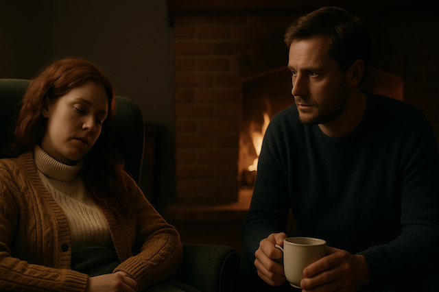 Когда стемнело, Дима занёс дрова, и мы втроём сидели у камина. Снег падал густо, будто кто-то нарочно накрывал мир ватным одеялом.
