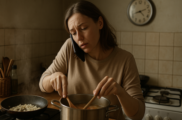 Ольга прижала телефон к уху плечом, помешивая суп. Лук потрескивал на сковородке, от него слезились глаза.