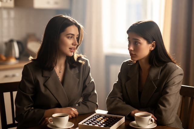 Сегодня мы сидели у тебя дома. Квартира большая, потолки высокие, на кухне стоит умный кофейный аппарат, который делает всё сам. Твой младший сын подбежал ко мне: «Тётя Лера, это тебе!» В руке — дорогая конфета в блестящей обёртке из коробки, которая стояла на столе просто так, без всякого повода. Я взяла, положила в карман, сказала «спасибо, солнышко». Он убежал.