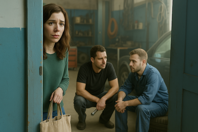 Виктория направилась туда, держа сумку в руках. Дверь в ремонтную зону была приоткрыта. Оттуда доносились голоса и запах машинного масла. Она уже собиралась войти, когда услышала знакомый тембр мужа.
