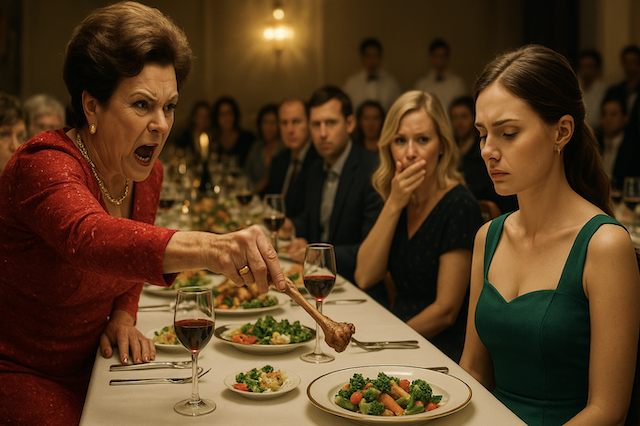 Когда подали курицу с овощами, Марта Петровна взяла кусок, шумно обглодала его и демонстративно бросила кость в тарелку невестки.